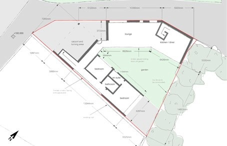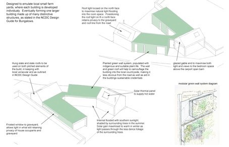 The Proposal is for a three / four bedroom house predominantly over one storey with two small loft like spaces at opposing corners of the scheme. The arrangement of low roofs is designed to ensure that views from neighbouring dwellings to the countryside are impacted upon as little as possible. The visual impact will be further diminished by the use of planted roof and wall systems, (on single storey elements) to camouflage the building into the vista.
