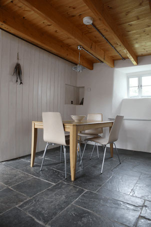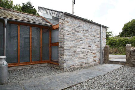 Both Planning Permission and Listed Building Consent were gained for the restoration and extension of 3 Newhall Green. The house had been abandoned after a poor restoration with inappropriate materials. Remedial work included adding drainage trenches, removal of inappropriate cement render and gypsum plaster, replacement with lime mortar and plaster, repointing, replacement roof trusses and recovered roof. The extension to the front contains a bathroom, utility room and WC, enclosed in stonework with lime mortar. The roof of traditional Cornish slate is glazed up one hip and along the ridge, connecting to the gable wall glazing to allow sun in throughout the day.