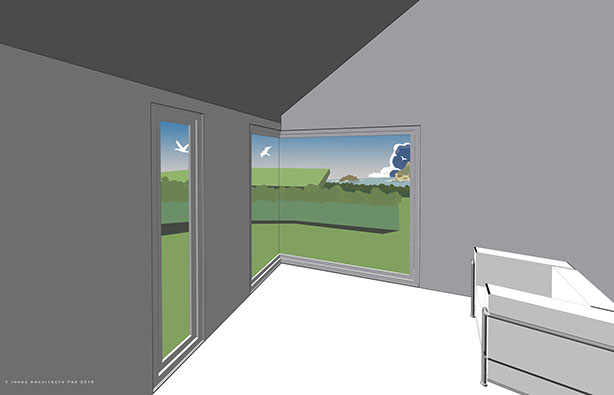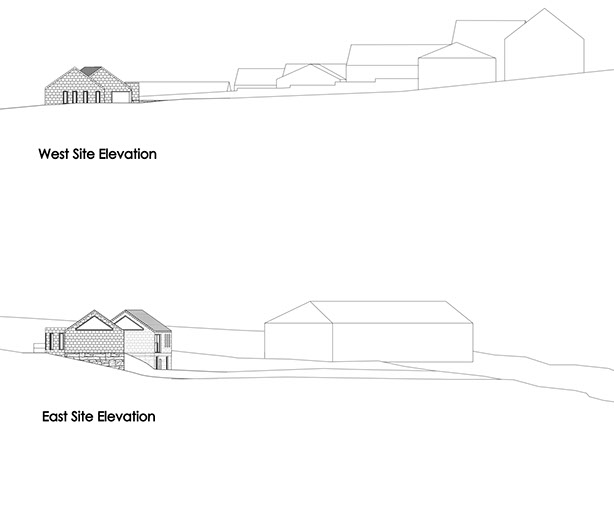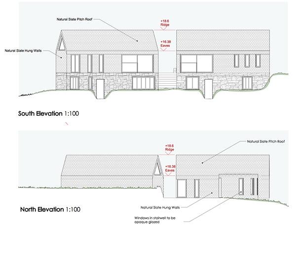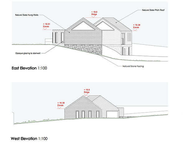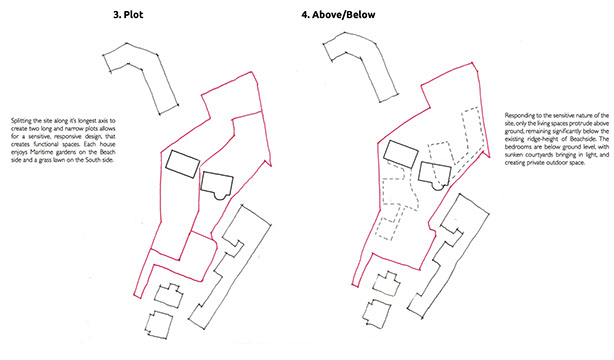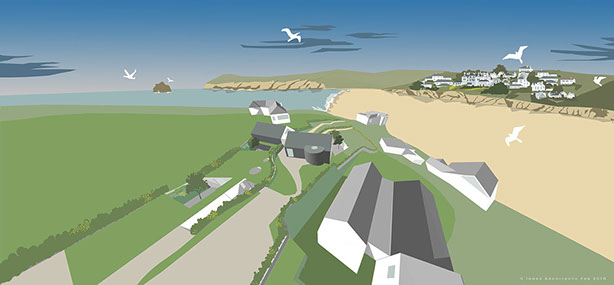 The design works into the landscape using natural slate and a traditional Cornish barn form. The sleeping accommodation is submerged into the ground with the roofs becoming amenity garden space and using voids to bring light into sunken courtyards and the bedrooms. The day accommodation is contained within the "barn" forms emerging from the landscape, raising the rooms up to gain views out over Polzeath.